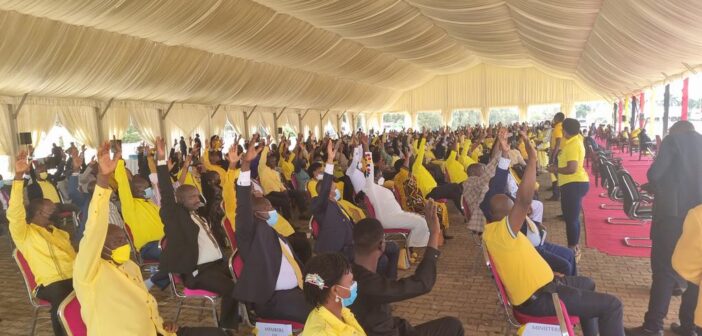Akabondo k’Ababaka ba National Resistance Movement – NRM akatudde ku kisaawe e Kololo olwaleero, Ababaka bonna ababaddeyo basizza kimu ngekuyege nti Rt.Hon Anita Among Annet yagenda okukwatira ekibiina bendera ku kifo kya Sipiika.