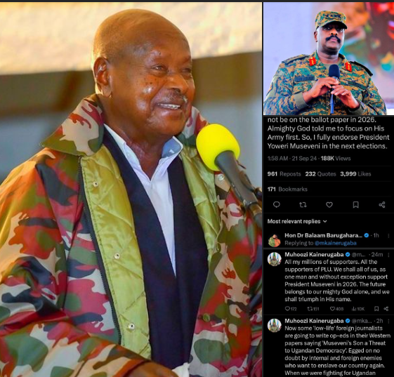 Gen. Muhoozi Kainerugaba avuddeyo nategeeza ku mukutu ggwe ogwa X nga bwatagenda kwetaba mu kalulu kobwa Pulezidenti nti era azze mabega wa kitaawe Gen. Yoweri Kaguta Museveni. Ono asabye abawagize be mu PLU bonna okuwagira Kitaawe mu kalulu ka 2026.