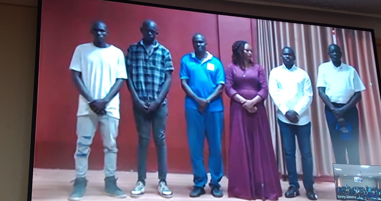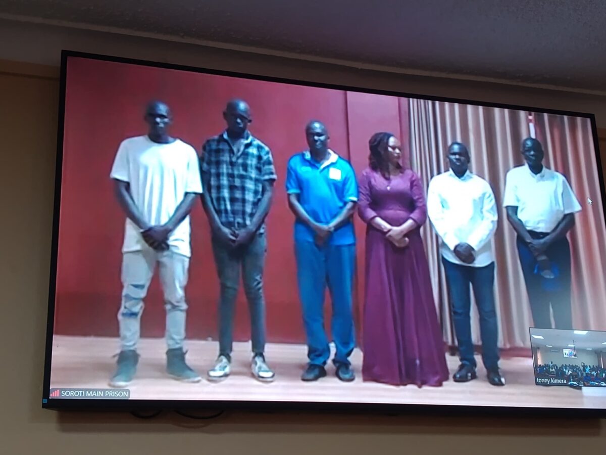 Pulezidenti wa Forum for Democratic Change Eng. Patrick Oboi Amuriat, Hon. Joan Alobo Acom, Hon. Jonathan Ebwalu, Sam Acaitum, Sylus Emesu, ne Agalamu Albert basimbiddwa mu maaso g’omulamuzi wa Kkooti y’e Soroti ngabayita ‘Video Conference’.