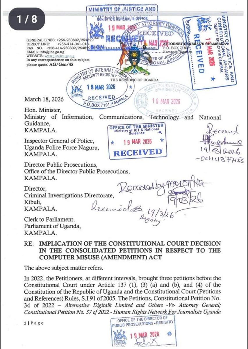 🗳️ Attorney General Kiryowa Kiwanuka avuddeyo nawandiikira Kkooti zonna wamu n’ebitongole bya Gavumenti nga abitegeeza ku nsala ya Kkooti etawulula enkayana za Ssemateeka okuyimiriza okuvunaana emisango nga gyekuusa ku buwaayiro: 11, 23, 26, 27, 28 ne 29 obwa Computer Misuse Act, 2023 n’akawayiro 162 aka Penal Code Act, obwasaziddwamu Kkooti. Alagidde emisango gyonna egigenda mu maaso nga gyekuusa ku buwayiro buno okuyimirira embagirawo era gigobwe.