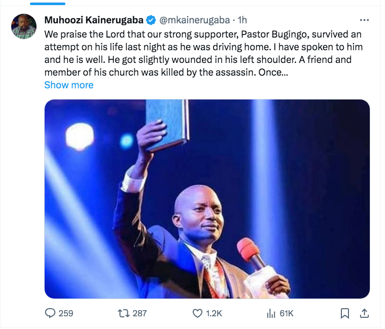 Gen. Muhoozi Kainerugaba; “Tusinza Mukama nti omuwagizi waffe owamaanyi omusumba Bugingo yasimattuse okuttibwa ekiro ekiyise bweyabadde avuga ngadda awaka. Njogeddeko naye era ali bulungi. Yafunyeeko ekiwundu kitono ku kibegabega ekya kkono. Mukwano gwe era mmemba w’e kkanisa ye yattiddwa. Nkubiriza abebyokwerinda okukola okunoonyereza mu bwanu abo abakikoze bavunaanibwe. Naye abamenyi b’amateeka bano bebaani? Ba ADF oba waliwo abajinga abalala? Twetaaga okuddibwamu eri ebibuuzo bino. Buno obulumbaganyi bwakubiri ku bawagizi baffe mu myezi 8 egiyise naye tewanabaawo muntu akwatibwa. Omusango gwokutta Isma Olaxess tegwafundikibwa. Nziramu okwebaza Mukama nti Pastor Bugingo yasimattuse obulumbaganyi buno.”