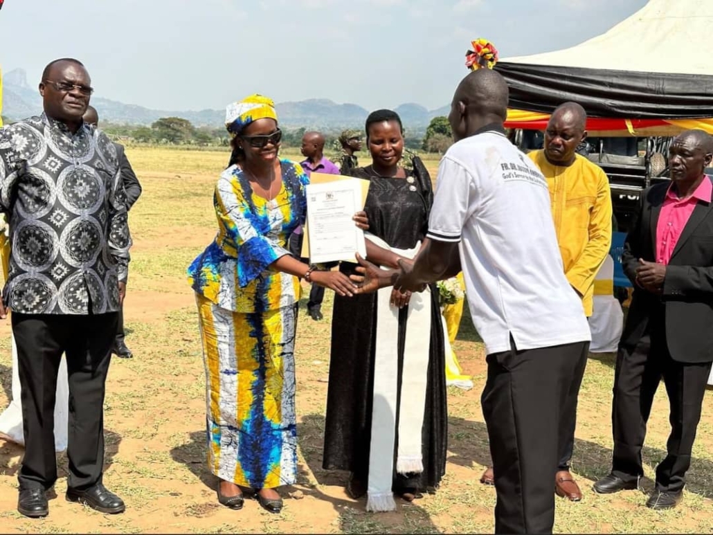 Minisita avunaanyizibwa ku nsonga ettaka, amayumba n’okuteekerateekera ebibuga Judith Nabakooba nga ali wamu ne Ssaabalamuzi Owiny Dollo, Omubaka Beatrice Akello, Ssentebe wa LC5 ne RDC wa Agago olunaku lweggulo bakwasizza amaka n’ebika ebissukka mu 1000 ebyapa byettaka kwebawangalira.