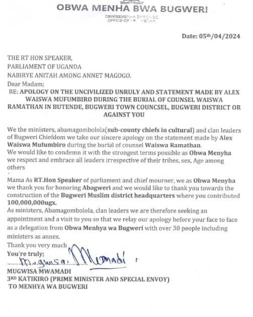 Obwa Menah bwa Bugweri buvuddeyo nebufulumya ekiwandiiko nga bwetondera Sipiika wa Palamenti Anitah Annet Among olw’ebigambo ebyayogerwa omumyuuka w’omwogezi wa National Unity Platform Alex Waiswa Mufumbiro mukuziika Munnamateeka Waiswa Ramathan eyafiira mu kabenje. Mufumbiro yasaba Sipiika Among okwesonyiwa Rt Hon Rebecca Alitwala Kadaga alekerawo okumwogerako ebikikinike kuba mukyala wa mirembe era yabesonyiwa.